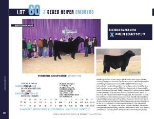 Ratliff Legacy 301L made a huge splash in the show ring as a heifer, earning Champion Limousin Female at the 2025 Cattlemen’ s Congress and Champion Limousin Female at the 2024 North American International Livestock Exposition. Her pedigree alone holds her to a high standard, being sired by FWLY Can Do and out of the profitable donor, Riverstone Charmed. Ratliff Legacy 301L is a flushmate to Ratliff Howboutit 008H, a top-earning donor for Sullivan Farms. Mated to the $ 190,000 valuation BLC / MLA Omega 2258, the extremely popular live lot from the 2023 Embryos on Snow Sale. BLC / MLA Omega 2258 is backed by strong maternal excellence, tracing to the Proven Queen Angus cow family and Silveiras Style. His sire was a division champion at the 2021 Cattlemen’ s Congress and goes back to the influential Dameron First Class Angus cow family, further solidifying the genetic strength behind this mating. Embryos are stored at Trans Ova Genetics and released upon payment. Will guarantee one 90 day pregnancy.