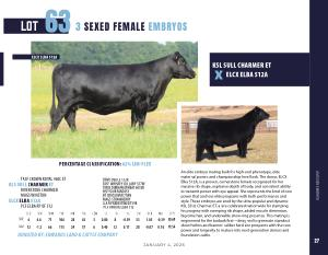 An elite embryo mating built for high-end phenotype, elite maternal power, and championship-level look. The donor, ELCX Elba 512A, is a proven, cornerstone female recognized for her massive rib shape, explosive depth of body, and consistent ability to transmit power with eye appeal. She represents the kind of cow power that anchors elite programs with both performance and style. These embryos are sired by the ultra-popular and dynamic KSL SSUL Charmer ET, a sire celebrated nationwide for stamping his progeny with sweeping rib shape, added muscle dimension, big-time hair, and undeniable show-ring presence. This mating is engineered for the tanbark first— designed to generate standout show heifers and banner-caliber herd sire prospects with the cow power and longevity to mature into next-generation donors and foundation cattle.
