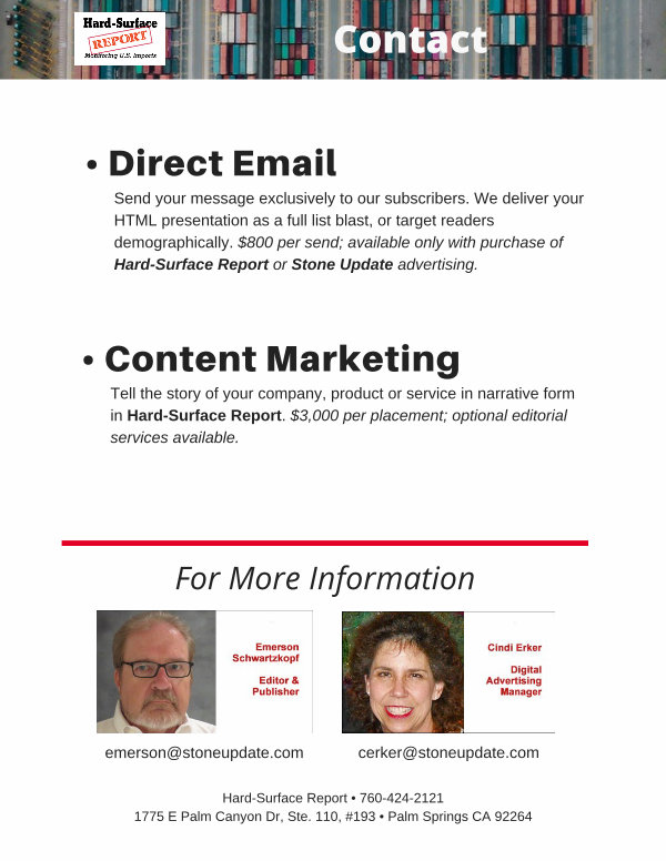 Send your message exclusively to our subscribers. We deliver your HTML presentation as a full list blast, or target readers demographically. $ 800 per send; available only with purchase of Hard-Surface Report or Stone Update advertising.