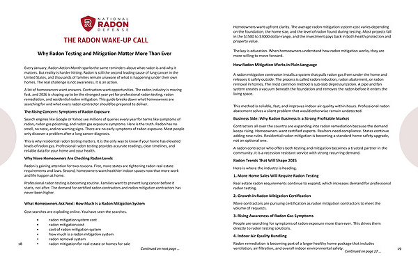 A radon contractor who offers both testing and mitigation becomes a trusted partner in the community. It is a recession resistant service with strong recurring demand.