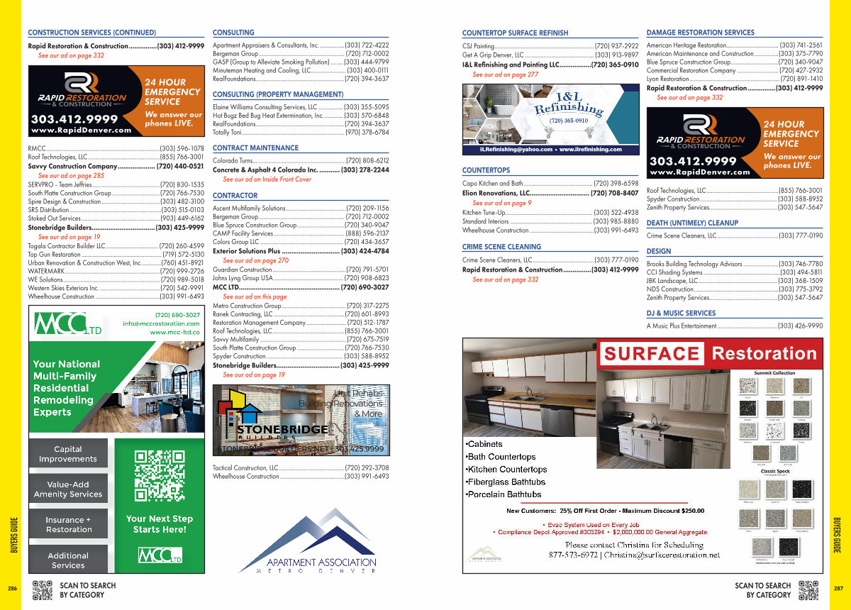 See our ad on this page Metro Construction Group...........................................( 720) 317-2275 Ranek Contracting, LLC...............................................( 720) 601-8993 Restoration Management Company...........................( 720) 512-1787 Roof Technologies, LLC................................................( 855) 766-3001 Savvy Multifamily.........................................................( 720) 675-7519 South Platte Construction Group................................( 720) 766-7530 Spyder Construction...................................................( 303) 588-8952 Stonebridge Builders..................................( 303) 425-9999