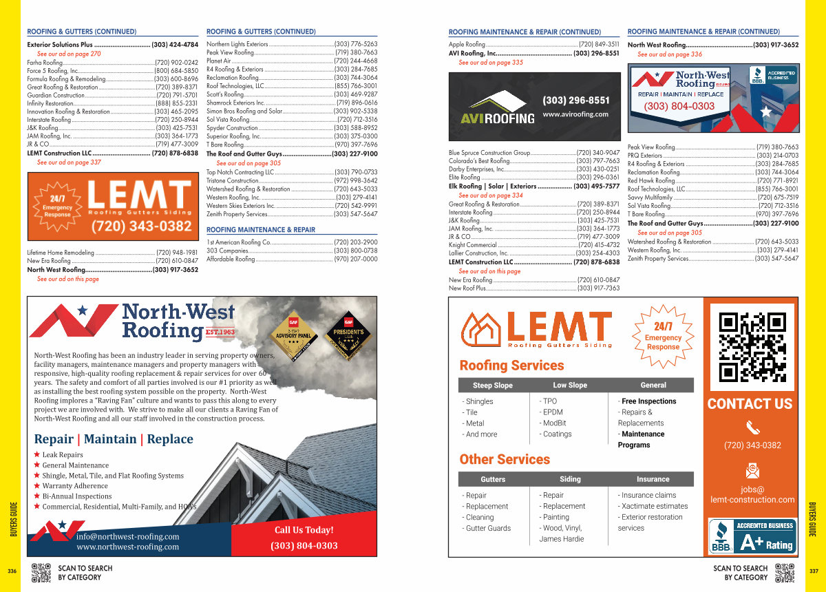 See our ad on page 305 Watershed Roofing & Restoration.............................( 720) 643-5033 Western Roofing, Inc....................................................( 303) 279-4141 Zenith Property Services.............................................( 303) 547-5647