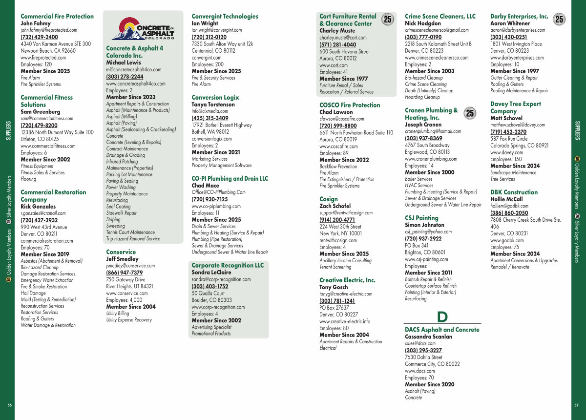 Commercial Restoration Company Rick Gonzales r. gonzales @ crcmail. com( 720) 427-2932 990 West 43rd Avenue Denver, CO 80211 commercialrestoration. com Employees: 70 Member Since 2019 Asbestos( Abatement & Removal) Bio-hazard Cleanup Damage Restoration Services Emergency Water Extraction Fire & Smoke Restoration Hail Damage Mold( Testing & Remediation) Reconstruction Services Restoration Services Roofing & Gutters Water Damage & Restoration
