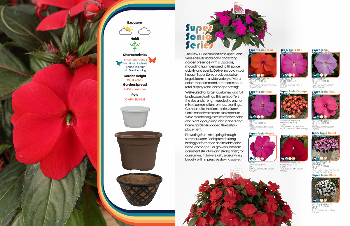 Super Sonic Series The New Guinea Impatiens Super Sonic Series delivers bold color and strong garden presence with a vigorous, mounding habit designed to fill space quickly and evenly. Delivering bold visual impact, Super Sonic produces extralarge blooms in a wide variety of vibrant colors that command attention in both retail displays and landscape settings.