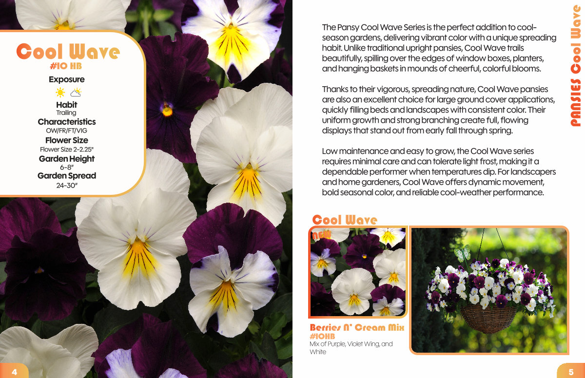 Thanks to their vigorous, spreading nature, Cool Wave pansies are also an excellent choice for large ground cover applications, quickly filling beds and landscapes with consistent color. Their uniform growth and strong branching create full, flowing displays that stand out from early fall through spring.