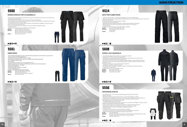 • Gesäß- und Beintaschen vorbereitet für Inbags Größen: C44 – C62, D84 – D120, C146 – C156 Material: 100 % Baumwolle, 375 g / m ²