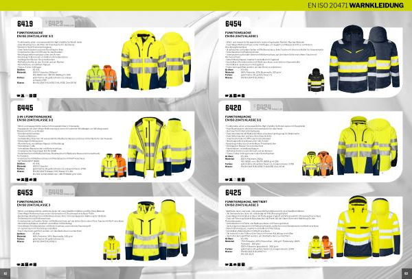 WS: 8000 mm / MVTR: 8000 g / m ²/ 24h Farben: gelb / marine-10, gelb / schwarz-11, orange / schwarz-1799 Klasse: EN ISO 20471 KLASSE 3; KLASSE 2 bei XS-M