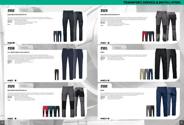 Buks uden læg. Sidelommer foran. Sikkerhedslomme med lynlås på højre side. Forhøjet i ryggen. To udvendige baglommer. Lårlomme med klaplukning med lomme til telefon. Tommestoklomme. Indvendige knælommer. Størrelse: C44 – C62, D84 – D120, C146 – C156 Materiale: 65 % polyester, 35 % bomuld, 245 g / m 2 Farve: