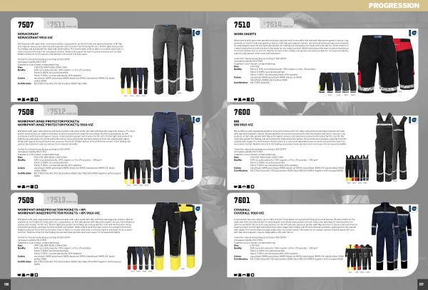 Quality: 63 % recycled polyester, 35 % organic cotton, 2 % spandex- 245 g / m 2 Fabric 2: 100 % recycled polyamide Fabric 3: 90 % recycled polyamide, 10 % spandex Colors: navy / black-5899, grey / black-9899, black / red-9935, black / black-9999 VIZ: black / yellow-9910 Certification: EN 17353 Class B2, VIZ black / yellow-9910 Class AB2, EN 14404 together with kneepad 9056