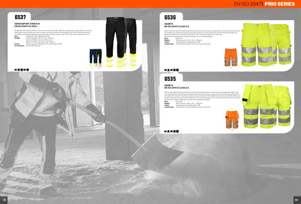 Quality: 1: 65 % polyester, 35 % cotton- 245 g / m 2 Material 2: 80 % polyester, 20 % cotton Material 3: 90 % polyamide, 10 % elastane Colors: yellow / navy-10, yellow / black-11, orange / black-1799 Certification: EN ISO 20471 Class 1