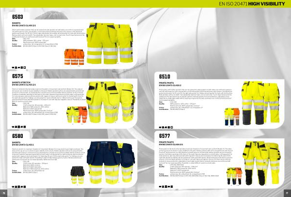 Quality: 1: 92 % polyester, 8 % spandex- 250 g / m 2 Material 2: 80 % polyester, 20 % cotton Material 3: 100 % polyamide Reinforcements: 100 % polyamide, Cordura ® Colors: yellow / navy-10, yellow / black-11, orange / black-1799 Certification: EN ISO 20471 Class 1 C44-C56, class 2 C58-C62