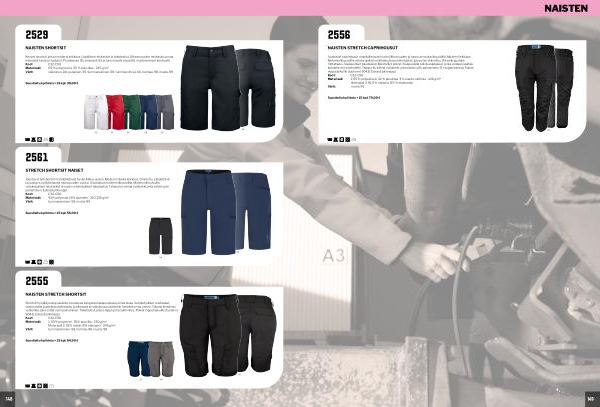 Shortsit hyvällä joustavuudella. Joustavaa kangasta takapuolessa ja haaroissa. Vetoketjulliset reisitaskut, vasemmalla puolella puhelintasku ja oikeassa sivutaskussa sisälenkki henkilökorttia varten. Takana leveämpi vyölenkki, joka estää vyön painamisen. Takataskut, joissa läppä ja tarrakiinnitys. Paikat riipputaskuille( tuotenro 9042). Edessä piilonappi. Koot: