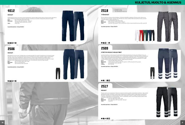 Farkkukangasmaiset housut joissa tuplavahvikekangas reisissä. Farkkutyylinen leikkaus takana ja kaksi takataskua. Paljon erikokoisia taskuja joissa paikkoja työkaluille, avaimille ja puhelimelle. Sisäpuolella paikat polvisuojille. Koot: