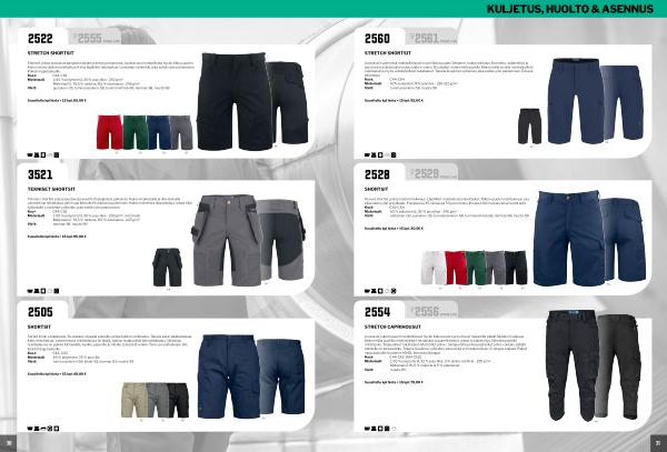 Kevyet shortsit, joissa moderni leikkaus. Läpälliset reisitaskut ja takataskut. Oikean puolen reisitaskuun saa kätevästi kynät ja työkalut. Punaisessa 35, sinisessä 53 ja tummanvihreässä 66 mustanväriset kontrastit. Koot: