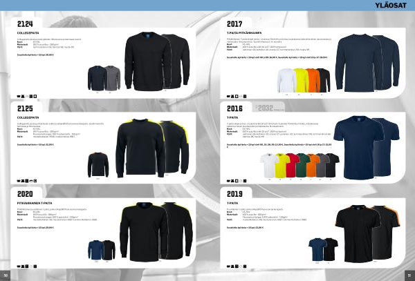 T-paita single jersey-neulosta( värit 10 ja 17 interlock-neulosta). Päivitetty mitoitus, kauluksessa kaksinkertainen joustoneulos ja niskanauha. Sivusaumaton. Koot: