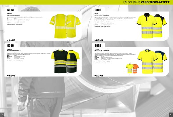 XS-4XL Materiaali: 100 % polyesteri- 140g / m 2 Värit: kelta / sininen-10, kelta / musta-11, oranssi / harmaa-17 Luokka: EN ISO 20471 LUOKKA 2