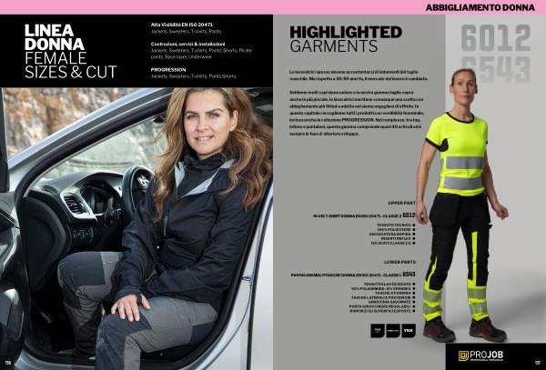 Sebbene molti capi siano unisex e la nostra gamma taglie copra anche le più piccole, le lavoratrici meritano comunque una scelta con abbigliamento più fitted e adatto noi siamo orgogliosi di offrirlo. In questo capitolo raccogliamo tutti i prodotti con vestibilità femminile, inclusa anche la collezione PROGRESSION. Nel complesso, tra top, intimo e pantaloni, questa gamma comprende quasi 40 articoli ed è sempre in fase di ulteriore sviluppo.
