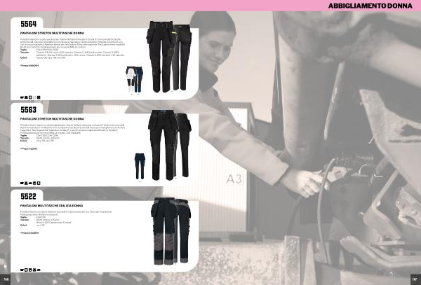 Pantaloni donna in tessuto elasticizzato. Tasche flottanti rinforzate in Cordura ®. Vari scomparti e tasche porta utensili. Tasca per smartphone con chiusura magnetica. Tasche posteriori foderate in Cordura ®, una con chiusura magnetica. Aperture laterali per ventilazione. Ginocchia sagomate. Porta ginocchiere regolabili. Rinforzi in Cordura ®. Predisposizione per accessori MOLLE-system. Taglie: C34-C50( C134-C150) Tessuto: Tessuto 1: 91,5 % nylon, 8,5 % spandex. Tessuto 2: 100 % poliammide. Tessuto 3: 100 % poliestere. Tessuto 4: 65 % poliestere, 35 % cotone. Tessuto 5: 89 % Cordura ®, 11 % spandex