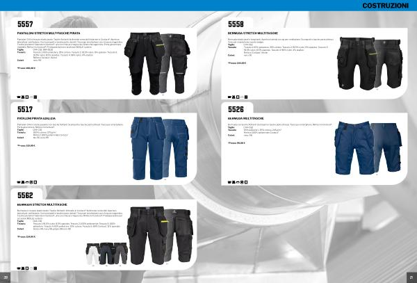 Bermuda elasticizzati e traspiranti. Aperture laterali con zip per ventilazione. Scomparti e tasche porta attrezzi. Vano per smartphone e porta-badge. Taglie: C44-C62 Tessuto: Tessuto 1: 65 % poliestere, 35 % cotone. Tessuto 2: 91,5 % nylon, 9 % spandex. Tessuto 3: 91,5 % nylon, 8,5 % spandex. Tessuto 4: 96 % nylon, 4 % elastan. Rinforzi: Cordura ®, Kevlar