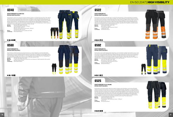 Hantverksbyxa i stretch för maximal rörelsefrihet. Modern passform. Fyrvägsstretch över lår och bak. Sidorna upptill är inte i stretch för att ge bättre stadga åt byxan. Hängfickor med Cordura ® förstärkt insida, varav den ena med dragkedja. Hängfickorna går att ta av genom att sprätta en kontrastfärgad, dold tråd. Benfickor, på vänster sida med plats för verktyg och penna, även en mobilficka med magnetlås och fäste för ID-kortshållare. På höger sida tumstocks- och verktygsficka med knivknapp. Fästen för verktygshållare. Förböjda knän. Knäskyddsfickor som går att reglera i två höjder, öppning inifrån. Cordura ® förstärkning över knä, lår, bakfickor, nederkant av ben samt hängfickor. Segmenterade reflexer från 3M. Storlek: C44-C62, D92-D120, C146-C156 Material: 1: 92 % polyamid, 8 % spandex- 250 g / m 2 Material 2: 100 % polyamid Material 3: 80 % polyester, 20 % bomull- 245 g / m 2 Förstärkning: 100 % Cordura ® Färger: gul / marin-10, gul / svart-11, orange / svart-1799 Certifiering: EN ISO 20471 Klass 1