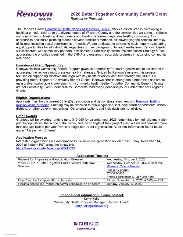 Overview of Grant Opportunity Renown Health’ s Community Benefit Program gives an opportunity for local organizations to collaborate in addressing the region ' s most pressing health challenges. Guided by Renown ' s mission, this program focuses on supporting initiatives that align with key health priorities identified through the CHNA. By providing Better Together Community Benefit Grants, Renown aims to strengthen partnerships and create measurable, sustainable improvements in community health. Better Together Community Benefits Grants are not Community Event Sponsorships, Corporate Marketing Sponsorships, or Partnership for Progress Grants.