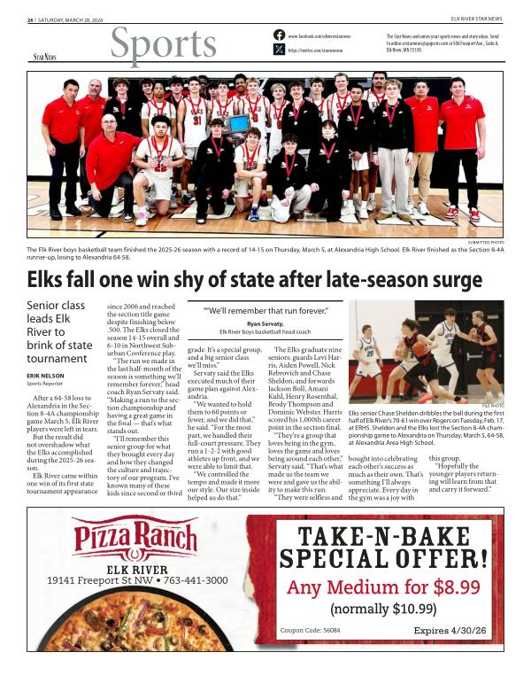 The Elk River boys basketball team finished the 2025-26 season with a record of 14-15 on Thursday, March 5, at Alexandria High School. Elk River finished as the Section 8-4A runner-up, losing to Alexandria 64-58.