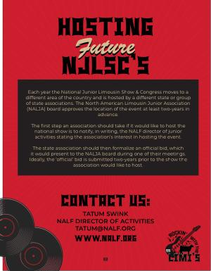 Each year the National Junior Limousin Show & Congress moves to a different area of the country and is hosted by a different state or group of state associations. The North American Limousin Junior Association( NALJA) board approves the location of the event at least two-years in advance.