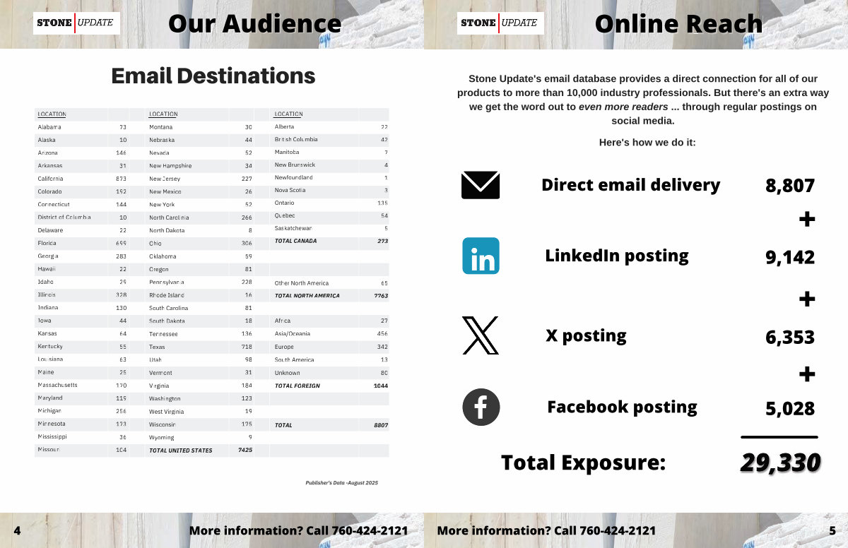 Stone Update ' s email database provides a direct connection for all of our products to more than 10,000 industry professionals. But there ' s an extra way we get the word out to even more readers... through regular postings on social media.