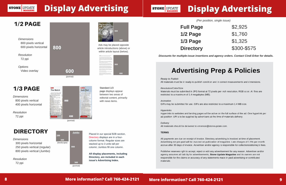 All display placements, including Directory, are included in each issue ' s Advertising Index.