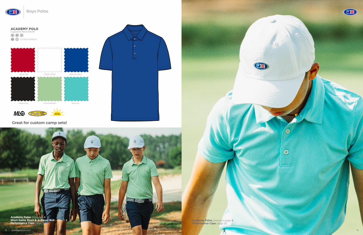 Academy Polos this page + Short Game Short & Jr Player Belt page 13 + Performance Caps page 26