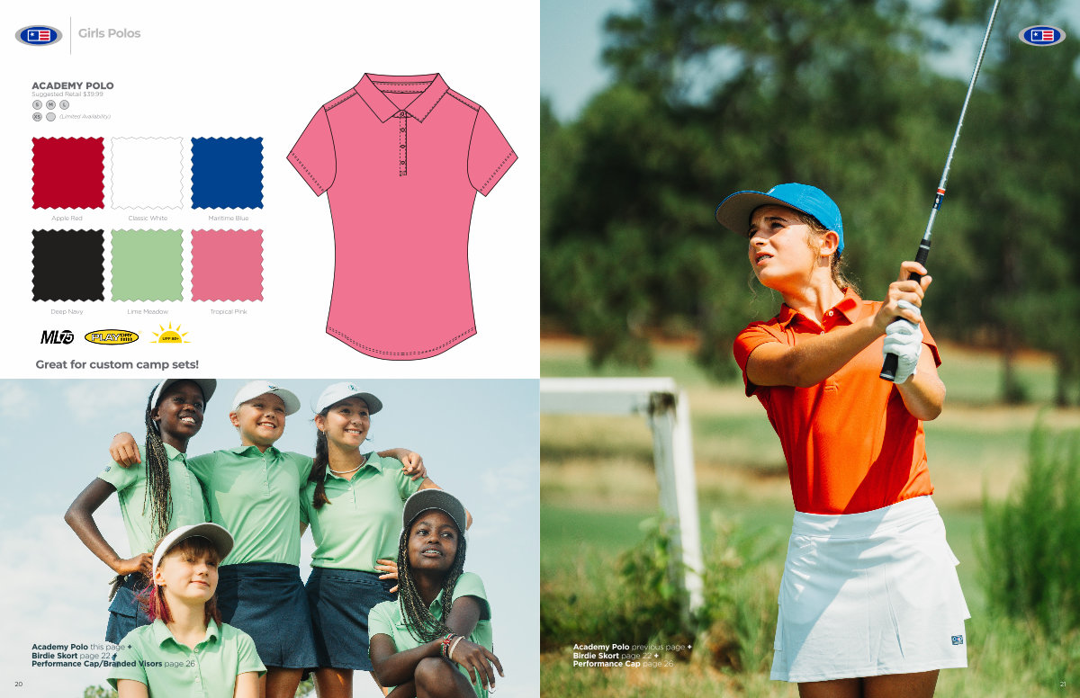 Academy Polo this page + Birdie Skort page 22 + Performance Cap / Branded Visors page 26