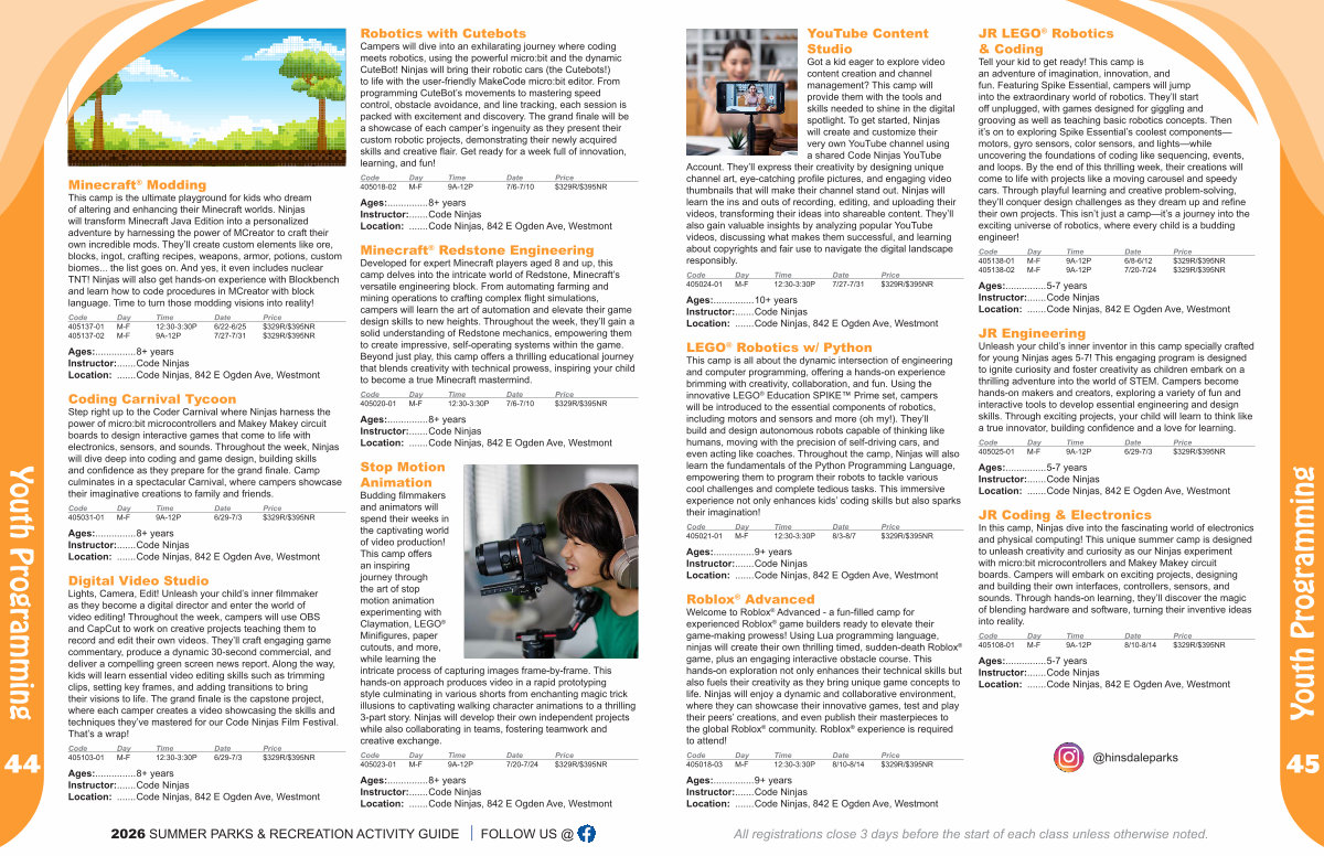 Ages:............... 9 + years Instructor:....... Code Ninjas Location:....... Code Ninjas, 842 E Ogden Ave, Westmont