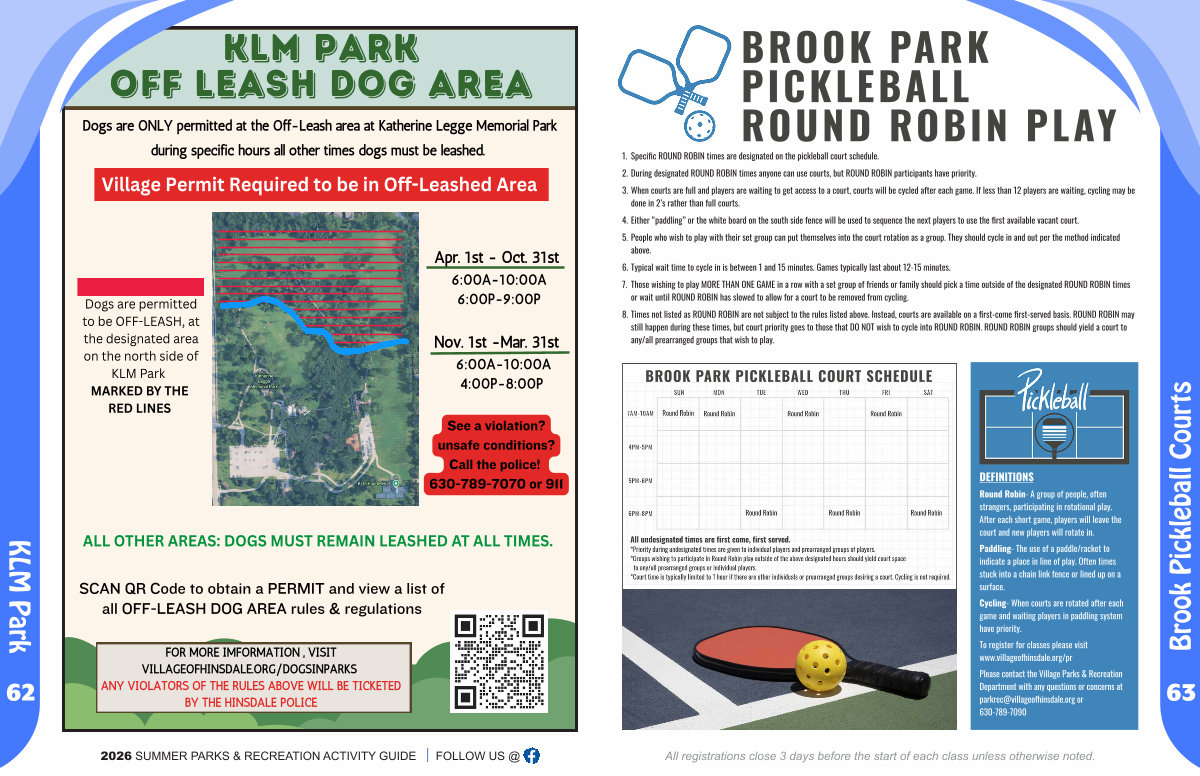 Please contact the Village Parks & Recreation Department with any questions or concerns at parkrec @ villageofhinsdale. org or 630-789-7090