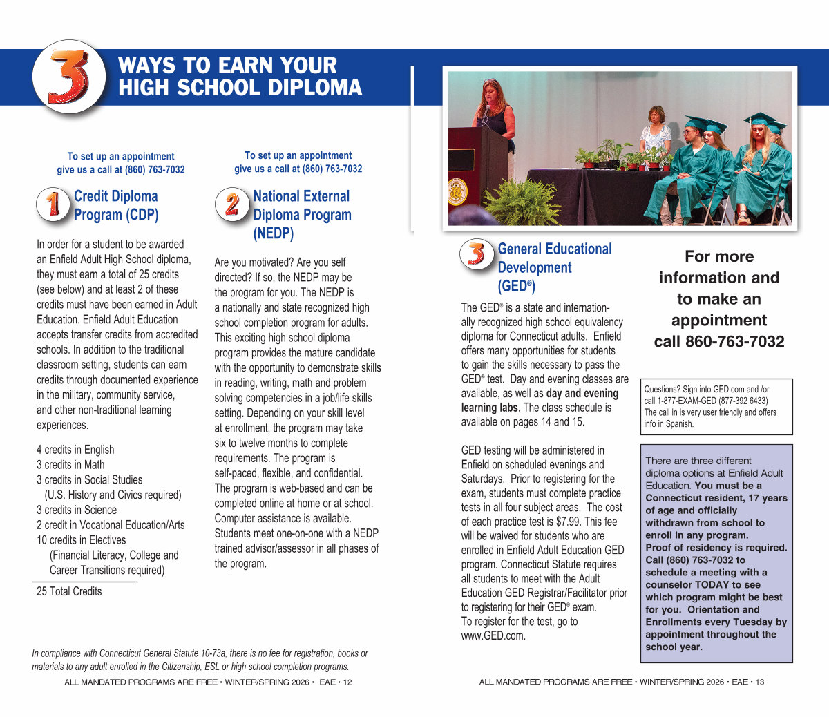 There are three different diploma options at Enfield Adult Education. You must be a Connecticut resident, 17 years of age and officially withdrawn from school to enroll in any program. Proof of residency is required. Call( 860) 763-7032 to schedule a meeting with a counselor TODAY to see which program might be best for you. Orientation and Enrollments every Tuesday by appointment throughout the school year.