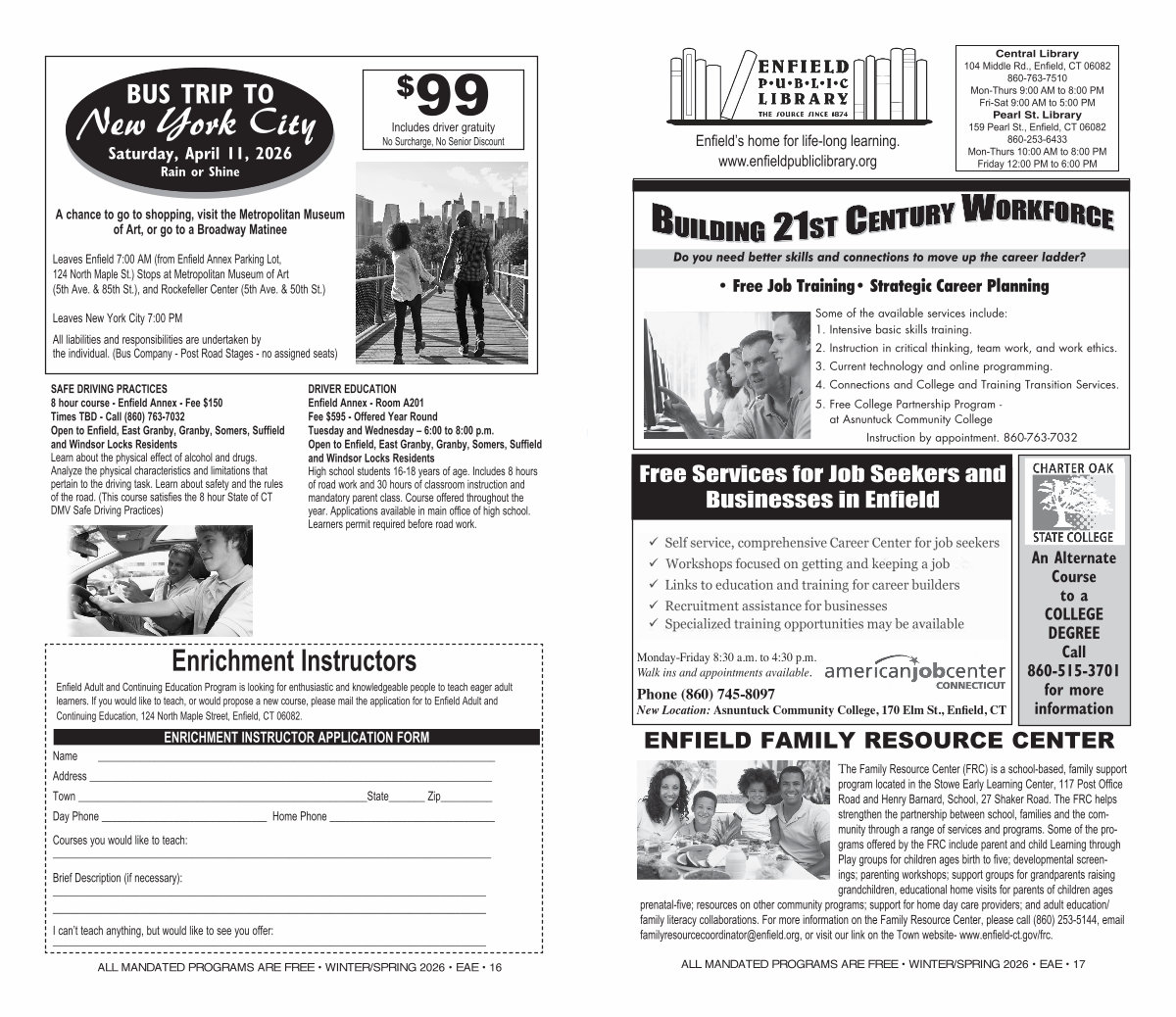 Enfield Adult and Continuing Education Program is looking for enthusiastic and knowledgeable people to teach eager adult learners. If you would like to teach, or would propose a new course, please mail the application for to Enfield Adult and Continuing Education, 124 North Maple Street, Enfield, CT 06082.