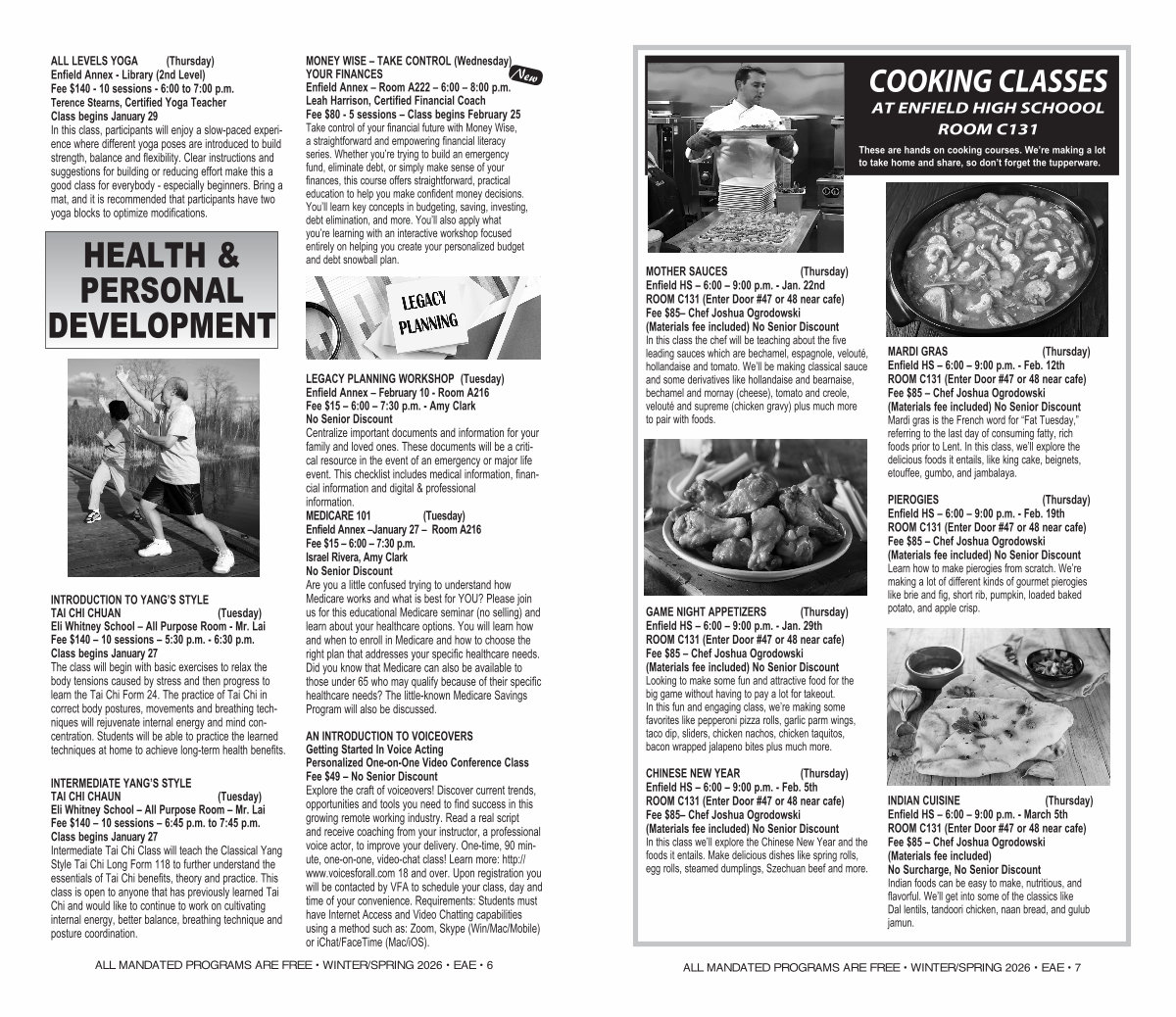 CHINESE NEW YEAR( Thursday) Enfield HS – 6:00 – 9:00 p. m.- Feb. 5th ROOM C131( Enter Door # 47 or 48 near cafe) Fee $ 85 – Chef Joshua Ogrodowski( Materials fee included) No Senior Discount In this class we’ ll explore the Chinese New Year and the foods it entails. Make delicious dishes like spring rolls, egg rolls, steamed dumplings, Szechuan beef and more.