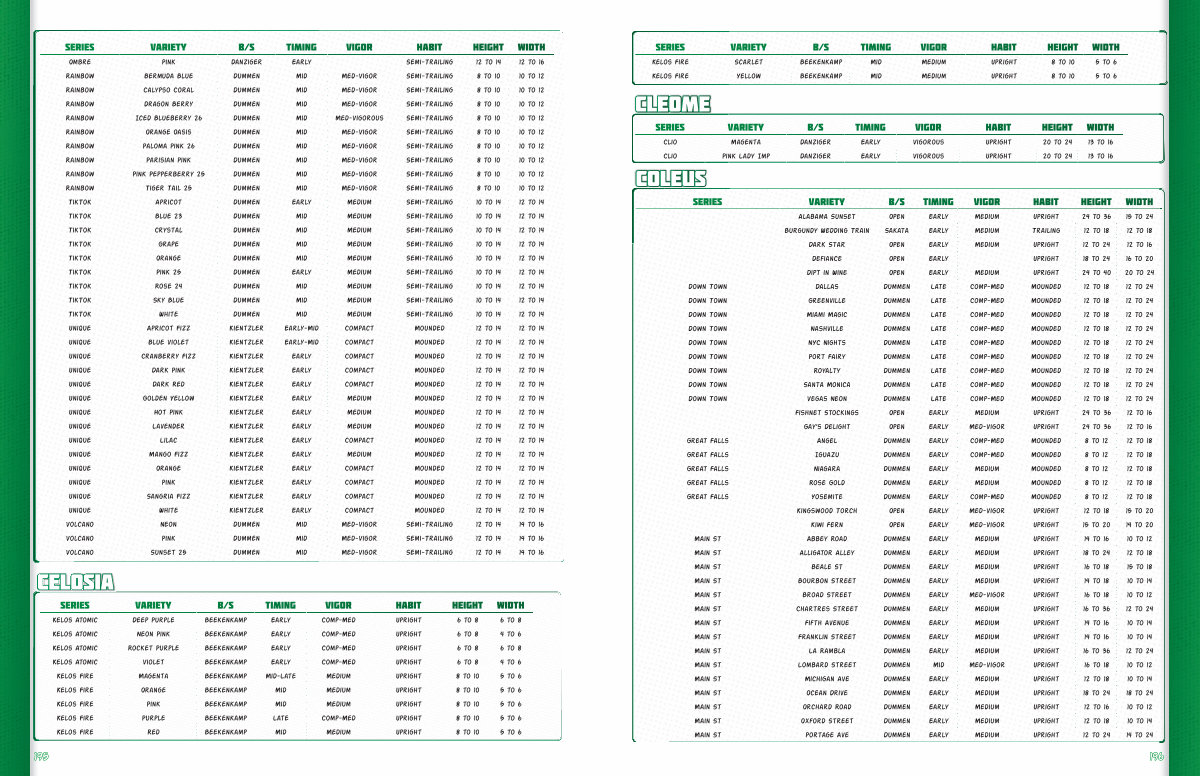 Kiwi Fern Open Early Med-Vigor Upright 15 to 20 14 to 20 Main St Abbey Road Dummen Early Medium Upright 14 to 16 10 to 12 Main St Alligator Alley Dummen Early Medium Upright 18 to 24 12 to 18 Main St Beale St Dummen Early Medium Upright 16 to 18 15 to 18