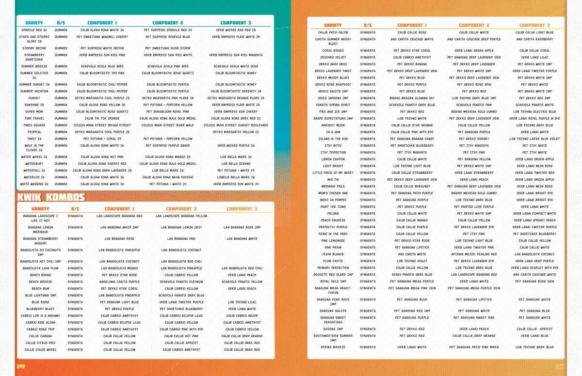 Fire And Ice Imp Syngenta Pet Dekko Red Bidens Mexican Gold Jumbo Lob Techno Electric Blue Grape Expectations Imp Syngenta Lob Techno White Pet Dekko Deep Lavender Vein Verb Lanai Royal Purple w Eye Harvest Moon Syngenta Calib Callie Star Orange Calib Callie Yellow Lob Techno Dark Blue In a Jam Syngenta Calib Callie Pink with Eye Pet Sanguna Purple Verb Lanai White Island in the Sun Syngenta Pet Sanguna Banana Candy Pet Dekko Sorbet Lob Techno Large Blue Violet