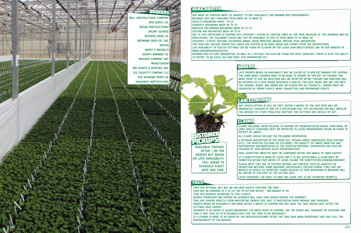 Ship week 50 through week 23. Subject to URC availability and minimum box requirements. Begonias are only available from week 50 to week 15. Selecta Geraniums week 1 to 23 Syngenta Geraniums week 45 to 23 Dianthus and Madinia Dipladenia week 40 to 23 Celosia and Helianthus week 50 to 31 Due to the limitations of shipping into Category 1 states at certain times of the year, because of the Japanese beetle regulations, the following states will not be available to ship to from week 23 to week 40: Category 1 states: Arizona, California, Hawaii, Idaho, Montana, Nevada, Oregon, Utah, Washington. This does not include poinsettias, which are rooted in an inert media and exempt from the restrictions. Live availability of rooted cuttings can be found by clicking on the Lucas Availability / ePicas link on our website @ www. LucasGreenhouses. com Growing and culture information, as well as a picture, can also be found for most varieties. There is also the ability to export to an excel file and print this information out.