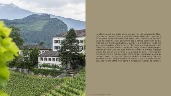 I walked around and asked some questions to neighbours in the Elgagass , but also walked to the schools , the municipality and to the church to ask some other inhabitants and visitors . The conclusion of my interviews was that the elder generation had a strong connection to the historical and traditional buildings , but they said that they could not stop the demolition of the buildings . They also said that money is the reason for the destruction of the historic village centres . Younger generations , however , did not even know the existence of these buildings around the corner , even if they were passing by them . I had also the opportunity to talk with the guide of the castle , who is also working in the municipality . He had the opinion that people have many fascinating ideas , but that the government do not have any kind of interest . This conclusion is one of the main points in my project , I wanted to consider .