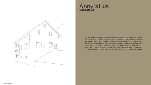 This traditional house with its associated stable was built in the 1870 at the edge of the “ Runder Büchel ”. It is marking the end of the hillside , as well as the orchards and the vineyards , where the settlement is beginning again . All historical houses along the hillside of the vineyards have a common architectural language : the entrance into the house is on the second floor , which is accessible through stairs . The gardens of the house are on the hillside , behind the building , which are also connected to the Elgagass with stairs .