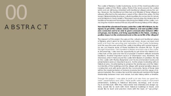 The research of the project focuses on the cultural and traditional values of Balzers , which seem to be lost more and more . As we can learn and profit a lot from the upcycling and restoration of the Castle Gutenberg , and the way the area around the castle is handling with natural resources , we can resume some of these traditions for modern life too . To get the right information , I first travelled to Balzers and had a trip in the castle . In this small trip , I also had the opportunity to get know the historical architecture of the past and the local people ’ s modern attitude towards traditions . Another important source of information was , therefore , the interviews , which I held around the castle hill in Balzers . In addition , the trip to the castle with Markus Burgmeier and his recommended books and presentations were an important source . As the project is dealing with an historical area , it is attempting to preserve the landscape and the historical identity of the buildings and the village with several sensitive steps in construction and with some rules for the community . Some of these rules will be the implementation of botanical production and the usage of regional materials . The construction and the rules should maintain the fragile relationship between man and nature , but also history within a timeline .