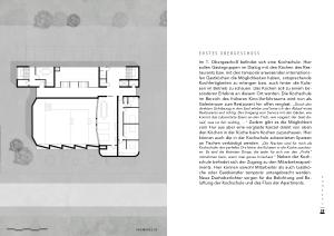 Im 1 . Obergeschoß befindet sich eine Kochschule . Hier sollen Gästegruppen im Dialog mit den Köchen des Restaurants bzw . mit den temporär anwesenden internationalen Gastköchen die Möglichkeiten haben , entsprechende Kochfertigkeiten zu erlangen bzw . auch hinter die Kulissen im Betrieb zu schauen . Das Kochen soll zu einem besonderen Erlebnis an diesem Ort werden . Die Kochschule im Bereich des früheren Kino-Vorführraums wird nun als Galerieraum zum Restaurant hin offen verglast . „ Durch den direkten Sichtbezug in den Saal erlebe und lerne ich den Ablauf eines Restaurants erst richtig . Der Umgang vom Service mit den Gästen , wie kommt das zubereitete Essen an den Tisch , wie reagiert der Gast darauf , was ist ihm wichtig , …“ Zudem gibt es die Möglichkeit vom Flur aus über eine verglaste Kanzel direkt von oben den Köchen in der Küche beim Kochen zuzuschauen . Hier können auch die in der Kochschule zubereiteten Speisen an Tischen verköstigt werden . „ Die Nischen sind für mich als Kochschüler der perfekte Ort hinter die Kulissen in die Küche zuschauen . Es sind die kleinsten Dinge , die jeder für sich von den „ Profis “