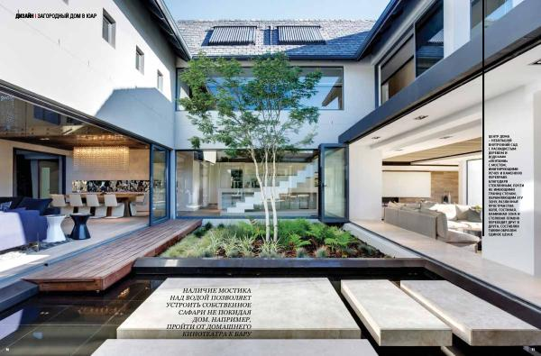 ЦЕНТР ДОМА – НЕБОЛЬШОЙ ВНУТРЕННИЙ САД С РАСКИДИСТЫМ ДЕРЕВОМ И ВОДНЫМИ « ЛЕНТАМИ » С МОСТОМ , ИМИТИРУЮЩИМИ РЕЧКУ И КАМЕННУЮ ПЕРЕПРАВУ . БЛАГОДАРЯ СТЕКЛЯННЫМ , ПОЧТИ НЕ ИМЕЮЩИМИ ГРАНИЦ СТЕНАМ , ОБРАМЛЯЮЩИМ ЭТУ ЗОНУ , РАЗЛИЧНЫЕ ПРОСТРАНСТВА : ХОЛЛ , ГОСТИНАЯ , КАМИННАЯ ЗОНА И СТОЛОВАЯ ПЛАВНО ПЕРЕХОДЯТ ДРУГ В ДРУГА , СОСТАВЛЯЯ ТАКИМ ОБРАЗОМ ЕДИНОЕ ЦЕЛОЕ 51