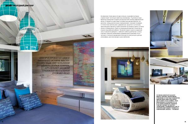 На верхнем этаже дома четыре спальни , в дизайне которых главенствуют тактильно приятные материалы . Тщательно подобранное освещение создает роскошную обстановку африканской виллы . В проекте существуют интересные декораторские « параллели » между различными помещениями : похожие по форме и стилистике светильники , деревянные « решетки » на потолке , оригинальные картины и даже похожие по колориту цвета : оттенки синего и бирюзового . Одно из помещений верхнего этажа было отдано под рабочий кабинет . Наличие второго света у каминной зоны позволило добавить к кабинету небольшой балкон . Стены в ванных комнатах облицованы деревянными панелями . В сочетании с теплым освещением получается элегантная и уютная атмосфера , располагающая к расслаблению .