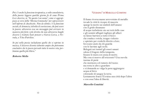 Il fiume riversa masse arroventate di metallo invade le città le ricopre di macerie sparge la morte sui simboli dell ’ umano con il grido disumano di acque turbolente sin sui tetti delle case e gli uomini affogati tagliano gli alberi ne fanno barriera a tutto il fuoco che romba e rotola , troppo violento e spietato per crederlo diretto a loro . Invocano aiuto da chi guarda con le lacrime agli occhi . Relegati nei tunnel gli esseri umani odono il fragore della tempesta , fissano le mura con ansia di morte . Ma cosa si muove all ’ orizzonte ? Una nuvola inerme di pietà che mormora col rumore del tuono ma resta in alto a guardare e si domanda se valga la pena aggiungere acqua al ferro colorando di sangue la terra . Lentamente frana l ’ Ucraina una città dopo l ’ altra e con essa l ’ idea di libertà .