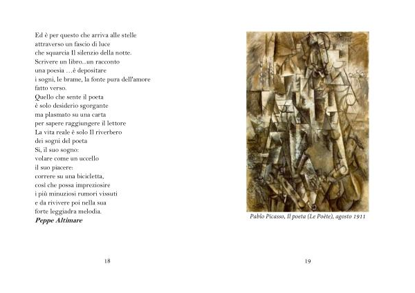 Ed è per questo che arriva alle stelle attraverso un fascio di luce che squarcia Il silenzio della notte . Scrivere un libro ... un racconto una poesia … è depositare i sogni , le brame , la fonte pura dell ' amore fatto verso . Quello che sente il poeta è solo desiderio sgorgante ma plasmato su una carta per sapere raggiungere il lettore La vita reale è solo Il riverbero dei sogni del poeta Si , il suo sogno : volare come un uccello il suo piacere : correre su una bicicletta , così che possa impreziosire i più minuziosi rumori vissuti e da rivivere poi nella sua forte leggiadra melodia . Peppe Altimare