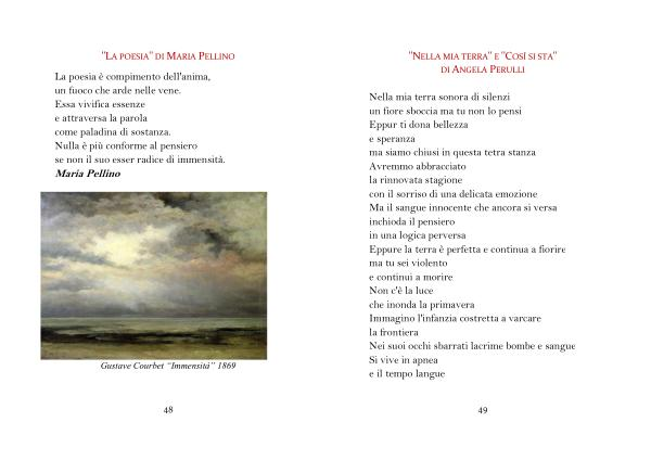 La poesia è compimento dell ' anima , un fuoco che arde nelle vene . Essa vivifica essenze e attraversa la parola come paladina di sostanza . Nulla è più conforme al pensiero se non il suo esser radice di immensità . Maria Pellino