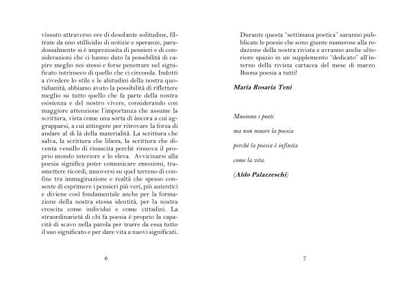 Durante questa “ settimana poetica ” saranno pubblicate le poesie che sono giunte numerose alla redazione della nostra rivista e avranno anche ulteriore spazio in un supplemento “ dedicato ” all ’ interno della rivista cartacea del mese di marzo . Buona poesia a tutti !
