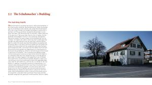 The Schuhmacher ’ s building was built in 1933 at the Kohlplatz in the municipality of Eschen ( Gemeinde Eschen , 1933 ). The builder was the shoemaker Armin Gstöhl , also called the Schuhmacher . First , the house consists of a simple rectangular volume with a pitched roof . The ground floor housed the shoemaker ‘ s workshop , the cellar , and the shoe shop . On the floors above were the living quarters . A few years later , due to a lack of space , further premises were added in the form of a workshop , storage facilities and a stable . The basic shape of the building was now an L-shape . The stable was used to store hay and housed pigs and chickens for self-sufficiency ( M . Ott , personal communication , March 4 , 2021 ). The result was that the building was spatial and functional split in two parts . The front building at the street consisted of the shoe shop and the residential area while the back part housed the cellar , workshops and the stable . The front building and the front garden are regarding to its close location to the street very prestigious , while the functional part of the house is kept more minimalistic . The house also has different levels . The functional part is laid out as a split level , while the stable is on a different level than the residential area . As the daughters grew older , the open loggia on the upper floor was converted into a bathroom . At that time , the garden played an important role and was a multifunctional space . Herb and vegetable beds were used for self-sufficiency , and laundry was dried on the clothesline . In addition , the garden served as a meeting place , recreation area and playground all in one . Due to the south-west orientation , the generous garden is on the sunny side of the house . But not only the garden , but also the shoe shop was a meeting place of important significance . Customers from the Unterland and Switzerland came in and out of the shop and often stayed for a chat after their purchase . The private and the business merge ( M . Ott , personal communication , March 4 , 2021 ).
